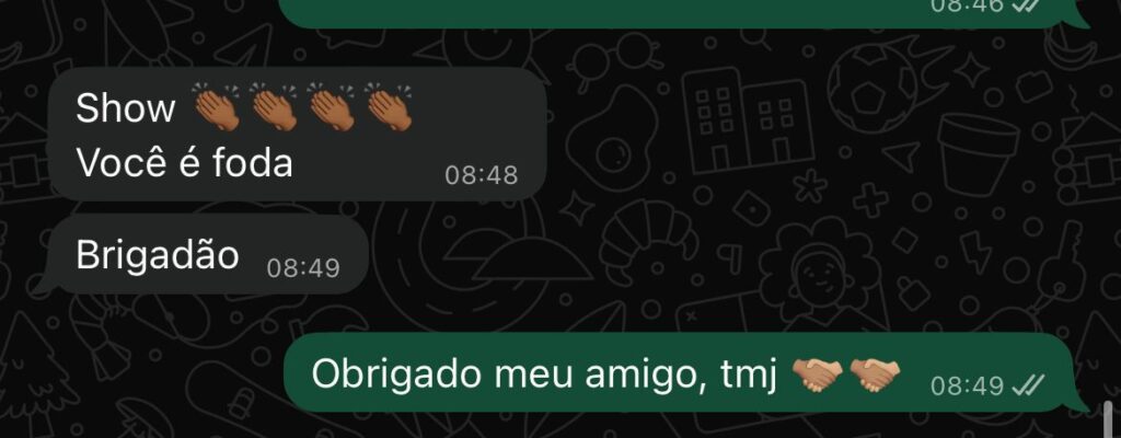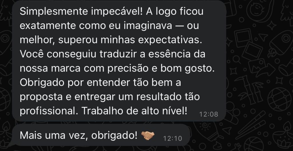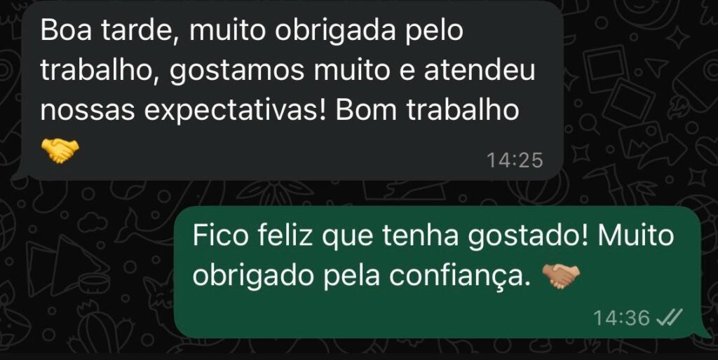 Compartilho as primeiras versões para análise. A partir do seu feedback, realizo ajustes e refinamentos até chegarmos ao resultado final, mantendo sempre o equilíbrio entre criatividade e estratégia.